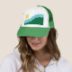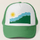Hat with a design with the flag of Spokane, Washington. A white and green flag with blue lines symbolising the Spokane river and Spokane Falls and a yellow sun