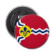 Button bottle opener with flag of city of St. Louis; red flag with white and blue waves and blue fleur-de-lys in yellow circle