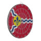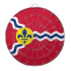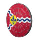Dartboard with flag of city of St. Louis; red flag with white and blue waves and blue fleur-de-lys in yellow circle