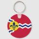 Button Keychain with flag of city of St. Louis; red flag with white and blue waves and blue fleur-de-lys in yellow circle