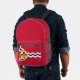 Backpack with flag of city of St. Louis; red flag with white and blue waves and blue fleur-de-lys in yellow circle
