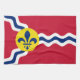 Kitchen Towel with flag of city of St. Louis; red flag with white and blue waves and blue fleur-de-lys in yellow circle