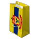 Paper bag with flag of city of St Paul, Minnesota; flag with three horizontal stripes of blue and yellow with red emblem in the centre