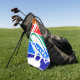 Golf Towel with a design with the flag of St. Petersburg, Florida. A flag with orange, red, green, blue, and navy blue stripes with a symbol of white pelican