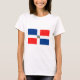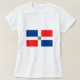 The flag of the Dominican Republic, as described by Article 96 of the Dominican Constitution, features a centred white cross that extends to the edges and divides the flag into four rectangles—the top ones are blue (hoist side) and red, and the bottom ones are red (hoist side) and blue. A small coat of arms featuring a shield with the flag design and supported by a bay laurel branch (left) and a palm frond (right) is at the centre of the cross; above the shield, a blue ribbon displays the national motto: Dios, Patria, Libertad (God, Fatherland, Liberty). Below the shield, the words República Dominicana appear on a red ribbon (this red ribbon is depicted in more recent versions as having its tips pointing upward). In the centre of the shield, flanked by three spears (two of them holding Dominican banners) on each side, is a Bible with a small cross above it and said to be opened to the Gospel of John, either to chapter one or chapter 8, verse 32, which reads Y la verdad nos hará libre (And the truth shall make you free). The blue on the flag stands for liberty, the white for salvation, the red for the blood of heroes. The civil ensign follows the same design, but without the charge in the centre. The flag was designed by the leader of the Trinitarians, the founding father (Padre de la Patria) Juan Pablo Duarte. To create distinct flags for state and civil use, the coat of arms, adopted in 1844, was placed on the state flag. The motto had been the password of the Trinitarians.