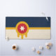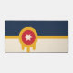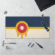 Desk Mat with a design with the flag of Tulsa, Oklahoma. A beige and navy blue flag with a gold Osage shield containing a red circle and a beige six-pointed star