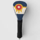 Golf Head Cover with a design with the flag of Tulsa, Oklahoma. A beige and navy blue flag with a gold Osage shield containing a red circle and a beige six-pointed star