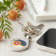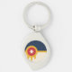 Keychain with a design with the flag of Tulsa, Oklahoma. A beige and navy blue flag with a gold Osage shield containing a red circle and a beige six-pointed star
