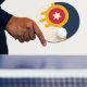Ping Pong Paddle with a design with the flag of Tulsa, Oklahoma. A beige and navy blue flag with a gold Osage shield containing a red circle and a beige six-pointed star