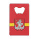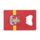 Bottle Opener with design with flag of Vilnius, capital city of Lithuania; red flag with yellow stripe and coats of arms with two golden lions holding a shield in the centre