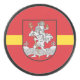 Hockey puck with design with flag of Vilnius, capital city of Lithuania; red flag with yellow stripe and coats of arms with two golden lions holding a shield in the centre
