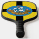 Pickleball Paddle with a design with the flag of Wellington City, New Zealand. A yellow flag with a black cross and the seal of the city with an image of a ship in the centre