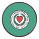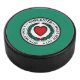 Hockey puck with flag of city of Worcester, Massachusetts; green flag with white emblem with red heart in the centre
