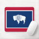 This design features the state flag of Wyoming, which is a doubly landlocked state in the western United States. It is the second most sparsely populated state in the country. Wyoming is bordered to the north by Montana, to the east by South Dakota and Nebraska, to the south by Colorado, to the southwest by Utah and to the west by Idaho and Montana. The official nickname of Wyoming is "Equality State", but it is also sometimes known as "Cowboy State" or "Big Wyoming". Wyoming's western half is mostly covered by the ranges of the Rocky Mountains, while the eastern half of the state is high-elevation prairie called the High Plains. Yellowstone national park is partially in Wyoming and Grand Teton national park is entirely within the state. Cheyenne is the state capital and the most populous city of Wyoming. The flag of the state of Wyoming includes a silhouette of an American bison. The red symbolises Native Americans and the blood of pioneers who gave their lives. The white is a symbol of purity and uprightness. The blue is the colour of the skies and distant mountains.