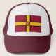 Hat with design with a flag of historic county of Northamptonshire, in England, Great Britain; maroon flag with a gold cross and the county’s traditional rose in the centre