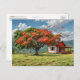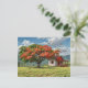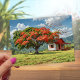 Experience the charm of Puerto Rican countryside with this watercolor postcard showcasing a vibrant flamboyán tree in full bloom. Set against a backdrop of a traditional wooden house and a scenic mountainous landscape, this 'estampa jíbara' captures the essence of rural Puerto Rican life.