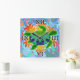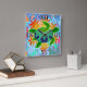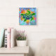 A digitally painted green sea turtle with a patterned shell against a background of orange kelp like flames. Colourful original sea turtle art. This clock has Roman numerals.