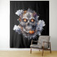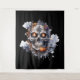 Flaming magic skull with autumn leaves, pumpkin and lilac pink.