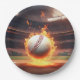 Flying baseball with flames on a ball field in a stadium background for sports birthday party.