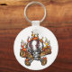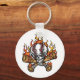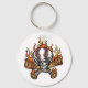 A flaming baseball skull with baseballs bats and flames. This design looks really effective on these Keychain