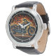 This close-up image features a striking watch face adorned with a powerful illustration. A custom chopper-style motorcycle, engulfed in vibrant orange and yellow flames, dominates the centre. The dark background enhances the fiery effect, while clear silver numbers and watch hands provide contrast, creating a bold and dynamic accessory for motorcycle enthusiasts.