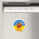 Show your support for Ukraine with this fridge magnet featuring round cutout of Ukraine's flag with flaming fist and "Glory to Ukraine", one of the country's most popular slogans, in curved text.
