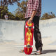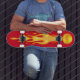 Flaming hot dragon ball in red orange & yellow on red Skateboard.