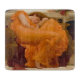 This design features a painting by the British artist Sir Frederic Leighton (1830–1896), who was famous for his works depicting historical, biblical, and classical scenes in an academic style. This painting shows a stunningly beautiful woman wearing a diaphanous red dress as she is curled up asleep. Some art historians have said that the toxic oleander branch in the top right could symbolise the fragile link between sleep and death. The rich colours and the elegantly recreated marble surround are characteristic of Leighton's realistic style, as is his lifelike use of natural light. This painting is widely considered to be Leighton's magnum opus and it was completed in 1895; it is currently housed in the Museo de Arte de Ponce, Puerto Rico.