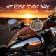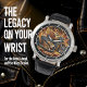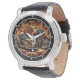This close-up image showcases a distinctive watch face with a bold, fiery illustration. A vintage-style motorcycle with a sidecar, both adorned with vibrant orange and yellow flames, dominates the centre. Large, feathered wings extend from the motorcycle's back. The dark background highlights the fiery design, creating a dynamic and striking timepiece.