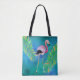 Our Florida-themed tote features an artistic-looking pink and mauve watercolor flamingo with black tail feathers walking between two colourful palm leaves on a beautiful aqua and green background. The graphic on the back of the tote shows the flamingo walking towards the left, with the palm leaves lining up on the bag's seams.