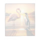 A surreal scene capturing a flamingo and penguin side by side, casting long shadows on a shimmering waterfront at sunset.
