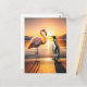 A surreal scene capturing a flamingo and penguin side by side, casting long shadows on a shimmering waterfront at sunset.