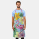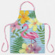Beautiful, pink flamingo in combination with colourful, watercolor, tropical flowers. Luau, adorable, blue stripe pattern, summer apron.