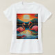 A.I. assisted print of two Flamingos attracted to each other stand gracefully in a vibrant landscape, with a large sun setting behind blue mountains and unusual surreal trees as the water reflects their elegant forms and the vivid colors of the sky.