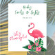 Baby shower invitation design features pink flamingo with lush green palm leaf fronds and tropical hibiscus flowers. "Aloha Baby". A tropical floral pattern with black background color dresses up the back of the card. Let's Flamingle!