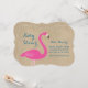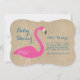 Elegant ribbon script and a bright pink flamingo on a beach sand background, decorate this baby shower invitation, making it perfect for a summertime, poolside or flamingo themed shower.