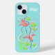 Lively pink flamingos flap their wings and ruffle their feathers against a blue watery background with reeds and water lilies. A mid-century inspired design with a retro touch which can be personalised with your own text, images and ideas. An original digital art image created by Quirky Chic.