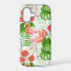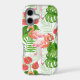 Watercolor pattern design with flamingo flowers and birds, monstera and palm leaves.