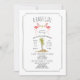 A baby shower invitation featuring an illustration of two flamingos holding bunting. Invite also features an illustration of an island with palm trees. Personalise the text.