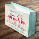 Tropical flamingo Christmas paper gift bag in large size with two places to add custom text. The sample saying is "Flamingo kisses and warm Christmas wishes" in aqua blue over beige. Four festive flamingos stand among blue starfish and wear holiday wreaths. The design and saying is printed on both sides. The rest of the bag is light blue in colour.