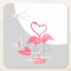 A pair of pink flamingos with necks curved to form a heart shape stand in the sea on a moonlit beach. A stylish, romantic design with a retro touch created in a pink, grey and white colour scheme with a colour-change background. A customisable design for you to personalise with your own text, images and ideas. An original digital art image.