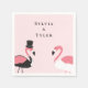 Flamingo-themed wedding paper napkins featuring a flamingo bride and flamingo groom on a pink background. Simply add your names, add these napkins to your cart, and enjoy your flamingo-filled wedding.