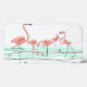 Mid-century inspired design with a retro touch featuring a group of pink flamingos standing in aqua water against a white background. A customisable design for you to personalise with your own text, images and ideas. An original digital art image created by Jess Perry at QuirkyChic Retro.