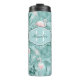 This thermal tumbler features a gorgeous pattern of flamingos surrounded by abundant tropical foliage and orchids in soft blush pink and teal. A label has been provided to hold your name and monogram or other text. Search ID868 to see other products with this cheerful, summery pattern.