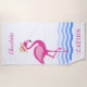 A cute pink flamingo wearing a sun hat at the beach, blue waves. Personalise and add your name, pink letters. The name is written with a modern hand lettered style script. With the text: Vacation