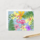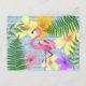 Beautiful, pink flamingo in combination with colourful, watercolor, tropical flowers and palm leaves. Luau, adorable, blue stripe pattern, summer postcard.