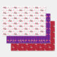 Flamingos gift wrapping paper for the holidays. Pink flamingos stand among blue sea stars on three large sheets of wrapping paper. The flamingos wear festive wreaths of hibiscus flowers and holly leaves. Paper colours are white, purple and red and have varying flamingo designs. One has “Seas and Greetings” wording in the pattern.