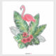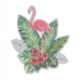 Illustration style graphic of a pink flamingo with green tropical leaves