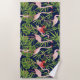 Flamingo Tropical Plants on Deep Blue Background Beach Towel