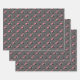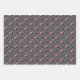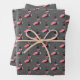 Fun flamingo wrapping paper sheets with a pattern of pink flamingos in tuxedos and top hats on a grey background.